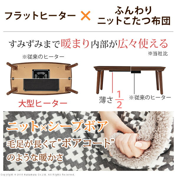 こたつ テーブル 長方形 ソファで使えるフラットヒーターこたつ〔ブエノ〕 90x50cm +北欧柄ふんわりニットこたつ布団 2点セット セット 布団 コタツ 継ぎ脚 継脚 高さ調節 ウォールナット 木製 こたつ布団 テレワーク リモートワーク ステイホーム